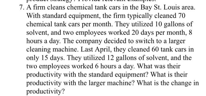 A firm cleans chemical tank cars in the Bay St. What is their productivity with the standard equipment for both Solvent and Labor. A firm cleans chemical tank cars in the Bay Gazimagusa area.